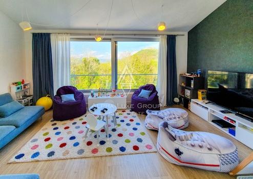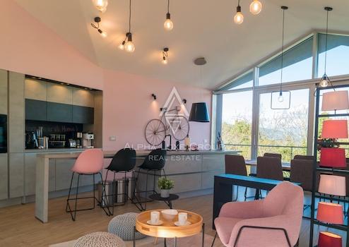 Im ersten Obergeschoss befinden sich eine offene Küche, ein Ess- und Wohnbereich, ein Gäste-WC, ein Arbeitszimmer (mit Umbaumöglichkeit), eine Terrasse und eine Loggia mit beeindruckender Aussicht.