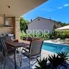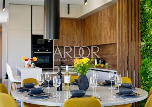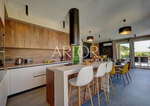Das Innere der Villa strahlt Eleganz aus – ein offenes Wohnzimmer mit modern gestalteter Küche und Essbereich bildet den Mittelpunkt des Hauses und eignet sich ideal für Familientreffen und Entspannung. Vier geräumige Schlafzimmer, jedes mit eigenem, luxuriös eingerichtetem Bad, bieten maximale Privatsphäre und Komfort, während sorgfältig ausgewählte Details den modernen Stil und ein Gefühl von Exklusivität unterstreichen.