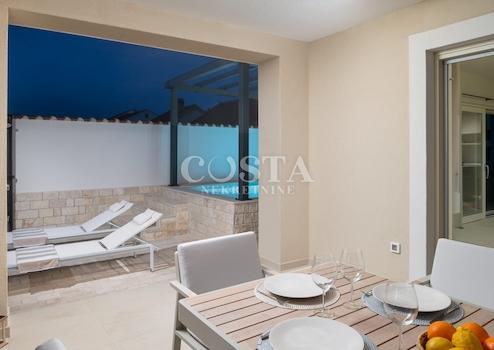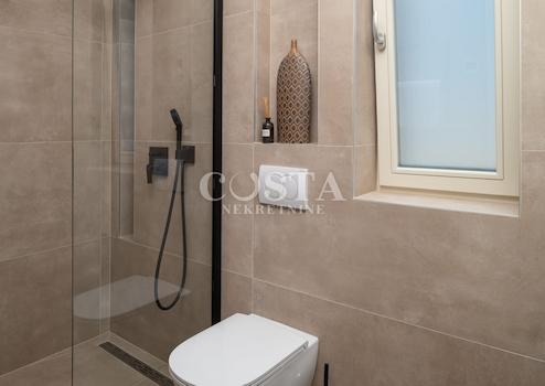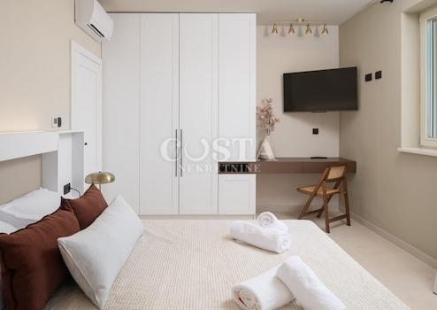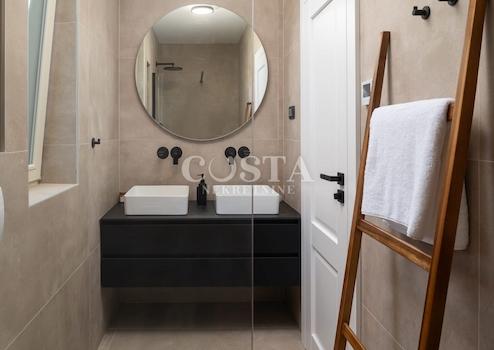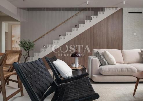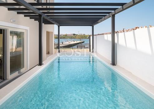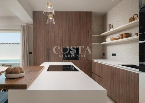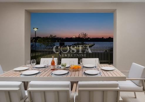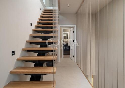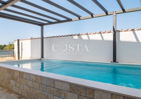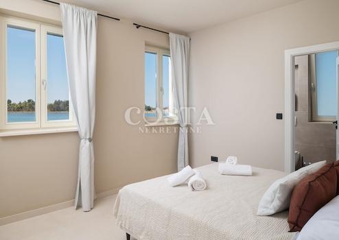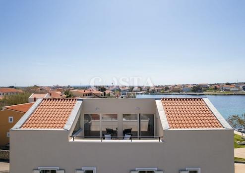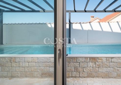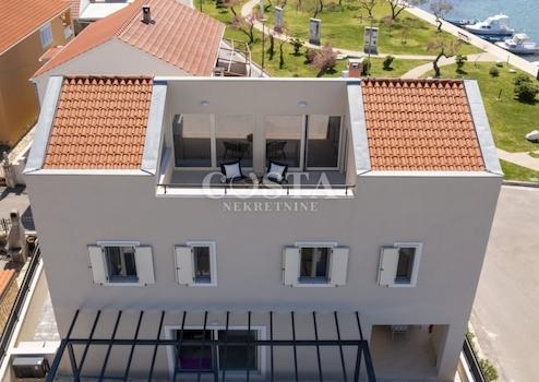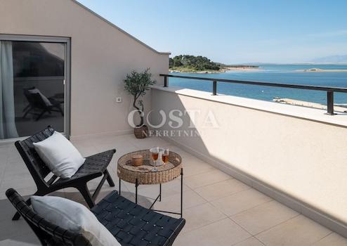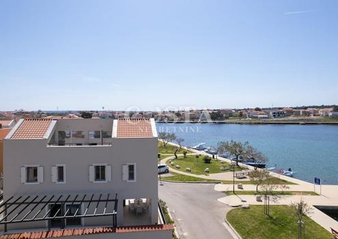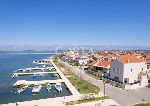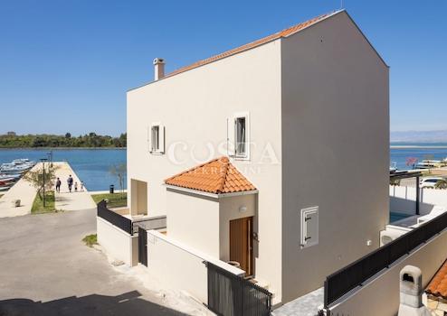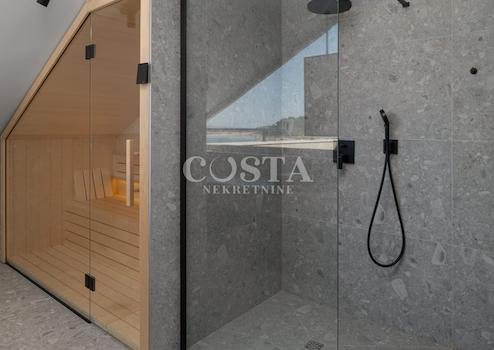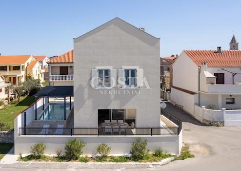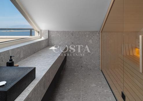 Diese luxuriöse Villa in Nin steht in bester Lage direkt am Meer zum Verkauf. Die Villa mit einer Wohnfläche von 167 m² befindet sich auf einem 214 m² großen Grundstück. Sie besteht aus Erdgeschoss, Obergeschoss und Dachgeschoss, und jede Etage bietet einen atemberaubenden Meerblick. Im Erdgeschoss befinden sich eine offene Küche mit Essbereich, ein Wohnzimmer mit Zugang zu einer Terrasse mit einem 25 m² großen, beheizten Pool, ein Abstellraum und ein Gäste-WC. Das Obergeschoss verfügt über drei Schlafzimmer mit jeweils eigenem Bad. Im Dachgeschoss befinden sich ein weiteres Schlafzimmer, ein Wellnessbereich mit Sauna, ein Badezimmer und eine 15,10 m² große, unüberdachte Terrasse. Private Parkplätze stehen auf dem Gartengrundstück zur Verfügung. Das Anwesen ist vollklimatisiert und verfügt über eine Fußbodenheizung mit Wärmepumpe.