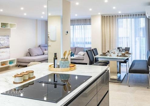 Der offene Wohn-/Essbereich mit eleganter Küche inklusive Kochinsel und Zugang zur verglasten Terrasse mit Blick auf den bepflanzten Innenhof lädt zu unvergesslichen Momenten mit Freunden und Familie ein. Zwei wunderschöne, großzügige Schlafzimmer mit Einbauschränken sowie zwei moderne Badezimmer en suite vervollständigen diese beeindruckende Wohlfühloase.