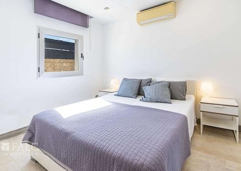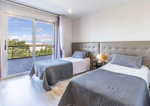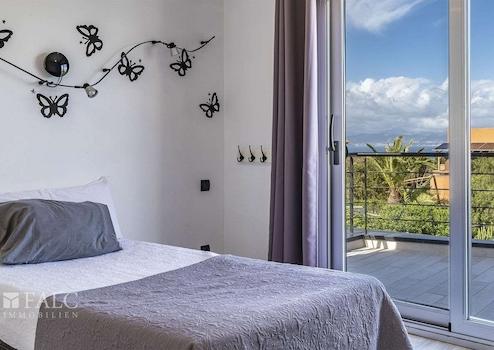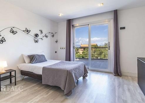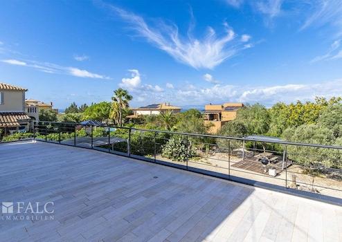 Im ersten Obergeschoss befinden sich drei weitere Schlafzimmer, eines davon en suite mit eleganter Ankleide, ein zusätzliches Badezimmer sowie ein kleiner offener Aufenthaltsraum, der sich flexibel als viertes Schlafzimmer, Bibliothek oder Büro nutzen lässt. Alle drei Schlafzimmer sind durch eine Terrasse miteinander verbunden und bieten traumhafte Ausblicke bis zum Meer und zum Tramuntana-Gebirge. Dank der idealen Ausrichtung genießt man die Sonne vom Sonnenaufgang bis zum Sonnenuntergang, was der Villa eine besonders warme Atmosphäre verleiht.