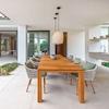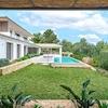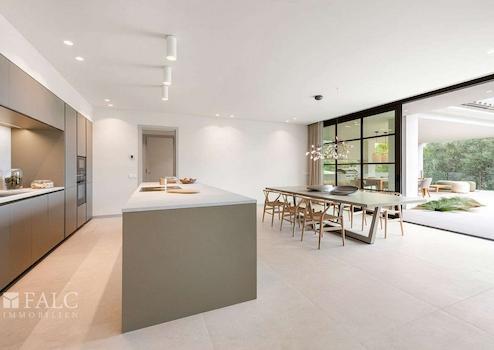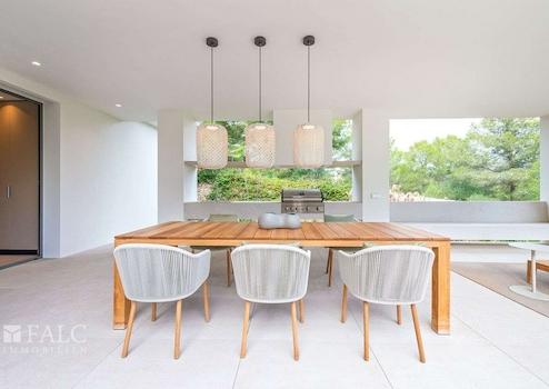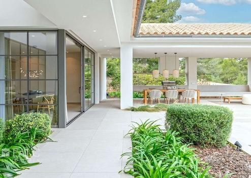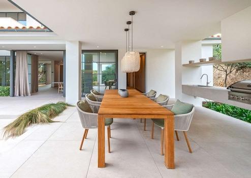 Vom Wohnzimmer aus gelangt man auf eine überdachte Veranda mit Außenküche, Grill- und Essbereich sowie direkt zum wunderschönen Salzwasser-Infinity-Pool, der von einem überdachten Sonnenliegebereich, mediterranen Garten und einem weiteren Chill-out-Bereich umgeben ist.