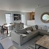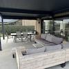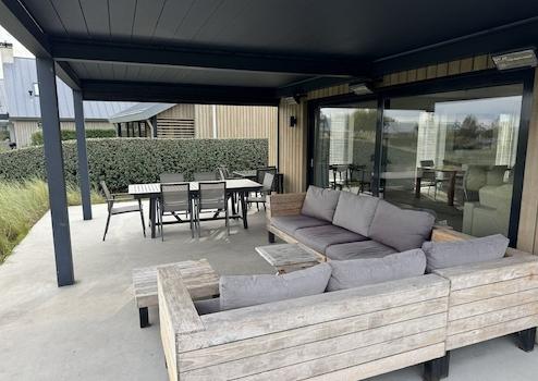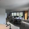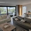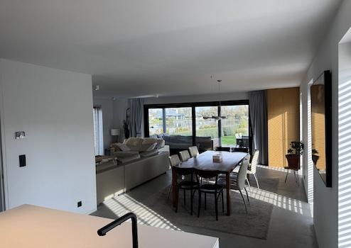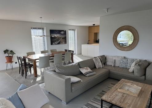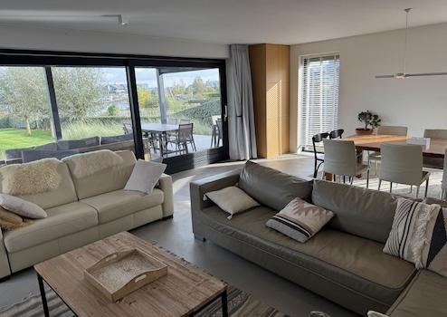 Großzügiges, 54 m² großes Wohnzimmer mit offenem Grundriss, Esstisch für 10 Personen und Sitzecke mit 55-Zoll-Fernseher und Blick auf Garten und Wasser. Ein Gaskamin mit Fernbedienung und ein großes Schiebefenster bieten Zugang zur Terrasse und zum Garten. Ein abschließbarer Abstellraum steht dem Eigentümer zur Verfügung.