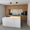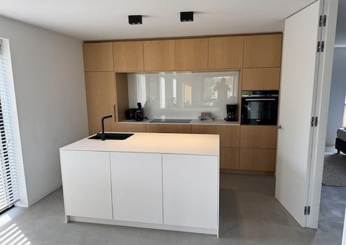 Offene Küche mit Kochinsel, heller Eichenholzfront, Induktionskochfeld, Heißluftofen, Geschirrspüler und großem Kühlschrank mit Gefrierfach.