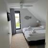 Schlafzimmer (11 m²) mit 2 separaten Betten, Blick auf den Garten und das Wasser, 24-Zoll-Fernseher.