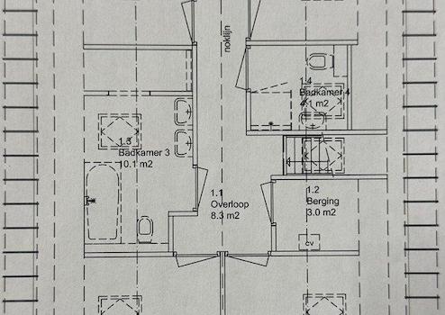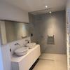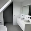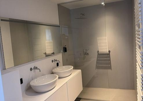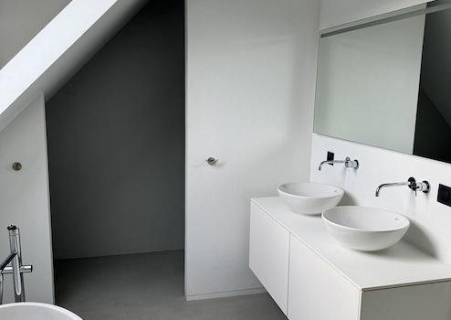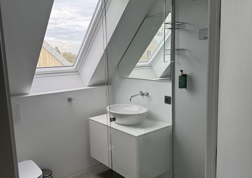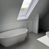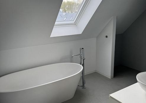 Im Obergeschoss befindet sich ein 10 m² großes Badezimmer mit Einzelwaschbecken, freistehender Badewanne, Toilette und ebenerdiger Dusche.