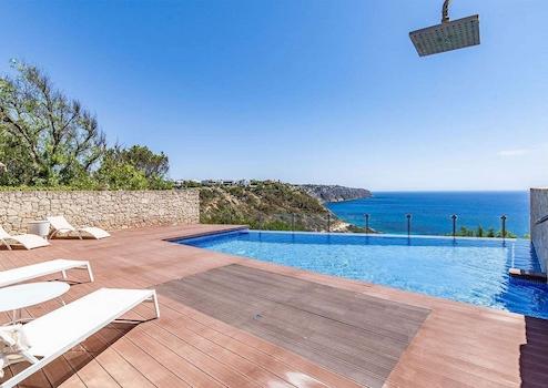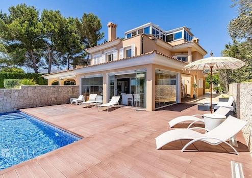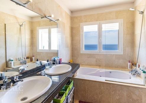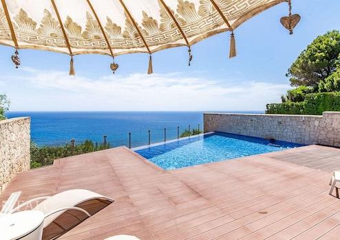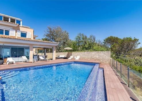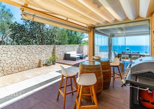 Der Außenbereich beeindruckt mit einem Salzwasser-Infinity-Pool mit Wassermassage, einer Außendusche, einem Grillplatz sowie einer großzügigen Terrasse, von der aus man den endlosen Blick auf das Meer genießen kann. Zur Ausstattung der Immobilie gehören doppelt verglaste Fenster, mallorquinische Blendläden, elektrische Rollläden, Parkett- und Marmorboden, Klimaanlage warm/kalt, Solarplatten, eine Osmose- und Entkalkungsanlage sowie Ölheizung. Eine Tiefgarage für bis zu drei Fahrzeuge rundet dieses außergewöhnliche Angebot ab.