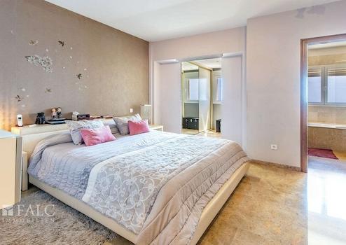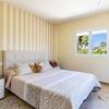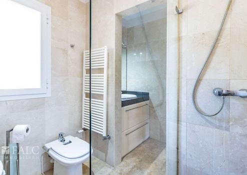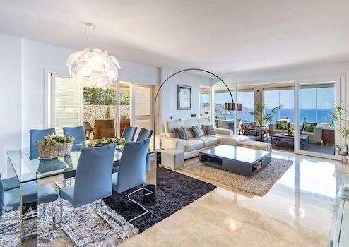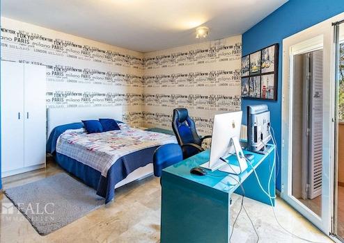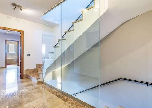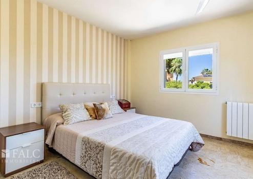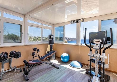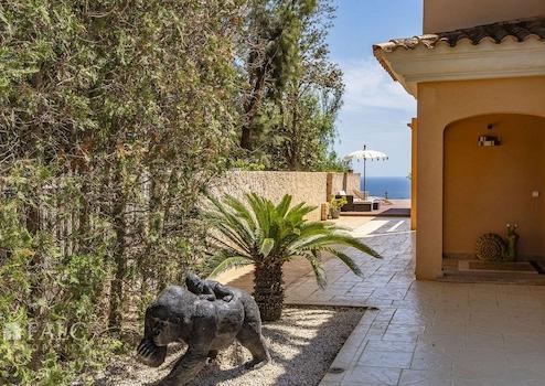 Im Erdgeschoss empfängt ein großzügiger Eingangsbereich, ergänzt durch ein Gästezimmer und ein helles Badezimmer, die Bewohner. Die voll ausgestattete Küche mit separatem Hauswirtschaftsraum öffnet sich zum eleganten Wohn- und Essbereich, von dem aus man direkten Zugang zur verglasten Winterterrasse und zum herrlichen Außenbereich hat. Auf der ersten Etage befinden sich drei Doppelschlafzimmer mit Einbauschränken sowie zwei Badezimmer. Das Hauptschlafzimmer überzeugt mit traumhaftem Meerblick, einer Ankleide und einem Badezimmer en suite, ausgestattet mit einer Whirlpool-Badewanne. Die zweite Etage ist dem Fitnessstudio vorbehalten und bietet einen ruhigen Rückzugsort für sportliche Aktivitäten.