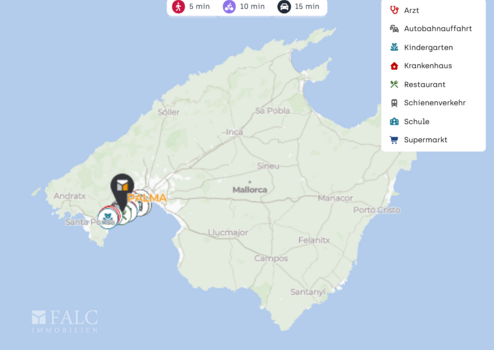 Die Nähe zu Palma de Mallorca, mit einer Entfernung von etwa 5 km zur nächsten Bahnstation, bietet zudem eine gute Anbindung an die Hauptstadt der Insel. Der Flughafen Palma de Mallorca ist in ca. 20 Minuten mit dem Auto erreichbar, was die Lage auch für Vielreisende attraktiv macht.