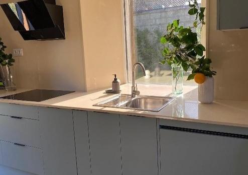 * Die Küche verfügt über Einbauschränke und eine große Speisekammer.
