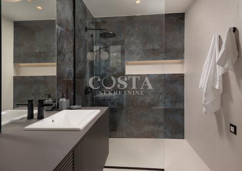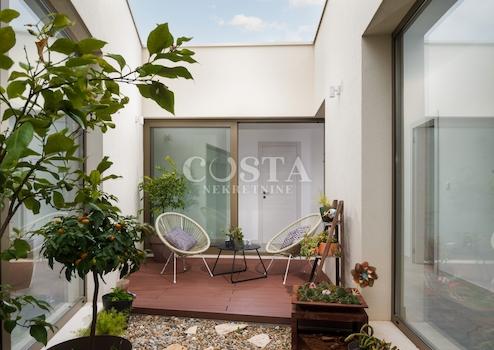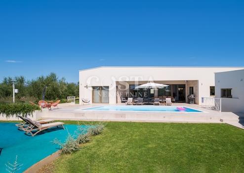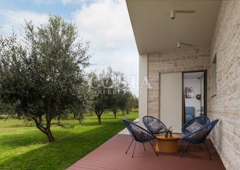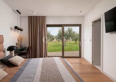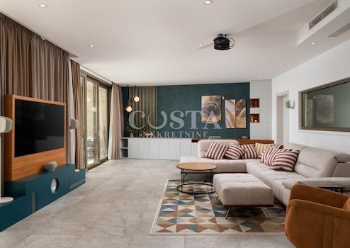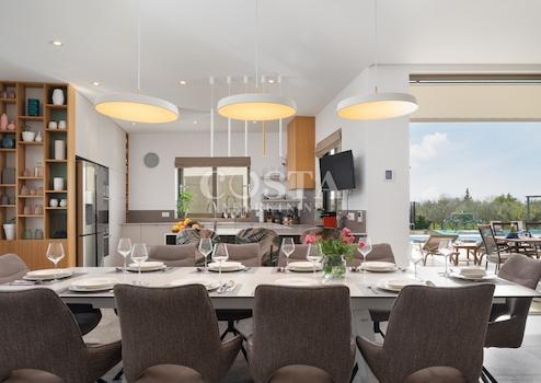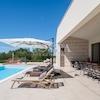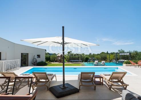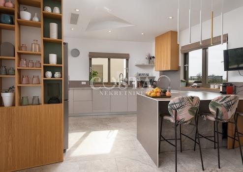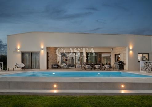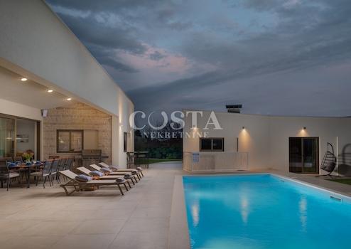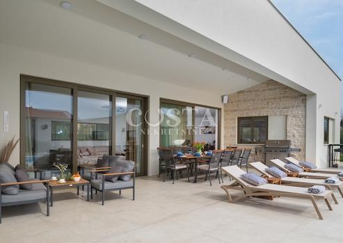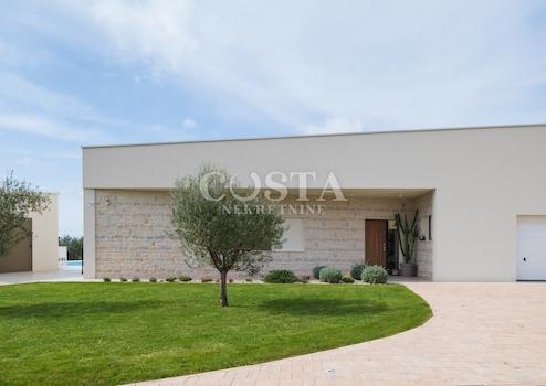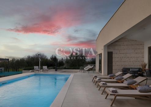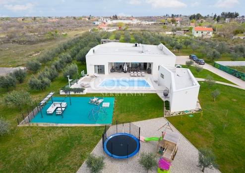 In Smoković bei Zadar steht eine luxuriöse, modern eingerichtete Villa mit Pool zum Verkauf. Die ebenerdige Villa mit einer Wohnfläche von 235,27 m² befindet sich auf einem großzügigen Grundstück von 3030 m². Sie besteht aus einem Haupt- und einem Nebengebäude. Das Hauptgebäude verfügt über ein geräumiges Wohnzimmer, eine offene Küche mit Essbereich, vier Schlafzimmer mit jeweils eigenem Bad, ein Gäste-WC, einen Abstellraum, einen Wintergarten und eine Garage. Auf der überdachten Terrasse befindet sich ein Esstisch, und im Innenhof erwarten Sie ein Swimmingpool, eine Liegewiese und ein Kinderspielplatz.