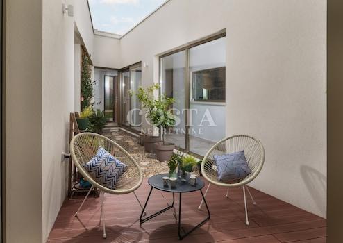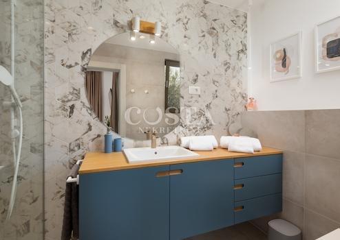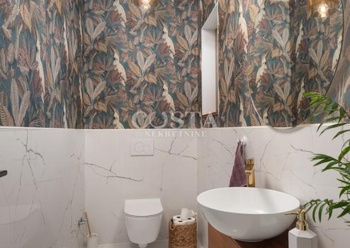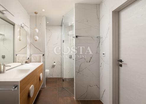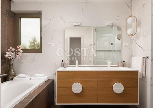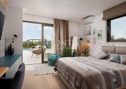 Die Villa ist mit modernster Technik ausgestattet, vollklimatisiert und verfügt über eine Fußbodenheizung mit Wärmepumpen. Für die Böden wurden Parkett und Keramikfliesen verlegt. Die Fenster und Türen sind aus Aluminium, und das geräumige Wohnzimmer verfügt über Deckenklimaanlagen. Eine große Glaswand sorgt tagsüber für viel Tageslicht.