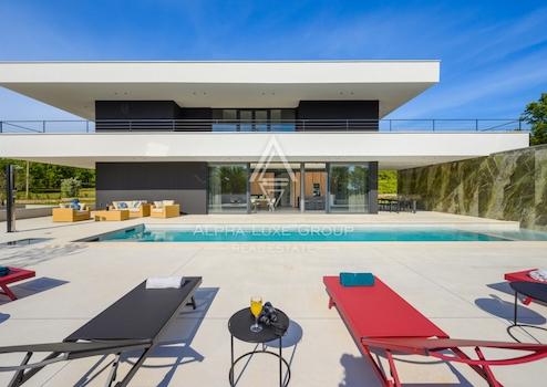 In einer ruhigen und malerischen gegend nahe Grožnjan gelegen, bietet diese außergewöhnliche moderne villa eine beeindruckende kombination aus luxus, privatsphäre und zeitgemäßem design. Auf einem großzügigen grundstück von 2.150 m² positioniert, verfügt die immobilie über 300 m² wohnfläche auf zwei etagen, die eine elegante und komfortable umgebung schaffen – ideal für ganzjähriges wohnen oder eine hochwertige investition.