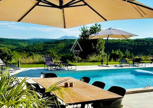 Die Innenausstattung mit luxuriösen Natuzzi-Möbeln sorgt für höchsten Komfort und Stil. Der gepflegte Garten von 2.459 m² verfügt über einen beheizten Pool (50 m²), eine Sommerküche, eine überdachte Terrasse, einen Kinderspielplatz mit Schaukeln und ein Trampolin – ein mediterraner Rückzugsort in vollkommener Privatsphäre.