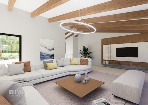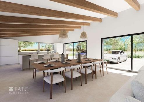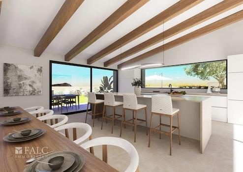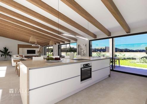 Diese fantastische Neubau-Finca befindet sich in einer ruhigen Lage, nur ca. 2,5 km von der Stadt Llucmajor entfernt. Auf einem ca. 21.112 m2 grossen Grundstück verspricht dieses Anwesen eine wahre Oase der Ruhe mit absoluter Privatsphäre und Komfort zu werden. Die Fertigstellung ist für Anfang 2027 geplant. Auf ca. 289 m2 bebauter Fläche verteilen sich die Räumlichkeiten grosszügig auf einer Wohnebene. Insgesamt stehen 4 Schlafzimmer und 5 Badezimmer zur Verfügung. Alle Schlafzimmer haben ein privates Bad und Zugang zum weitläufigen Garten. Der offene Wohn-/-Essbereich mit angrenzender Küche verfügt über Sichtbalken und grosse Panoramafenster. Diese bringen viel Licht in den Raum und schaffen eine nahtlose Verbindung zum beeindruckenden Aussenbereich mit Blick auf die Berge. Der grosse Pool bietet an heissen Tagen eine willkommene Erfrischung.