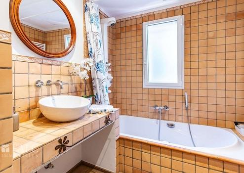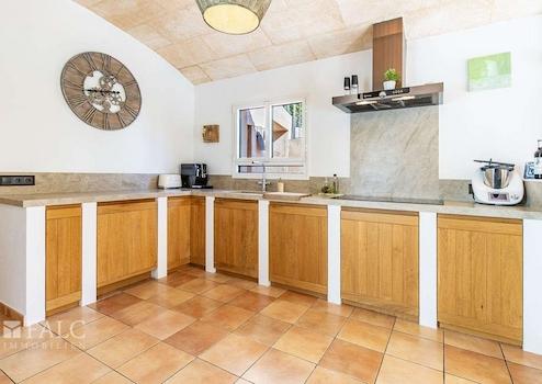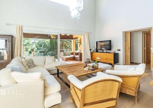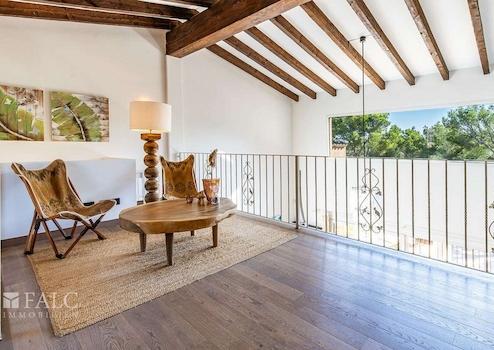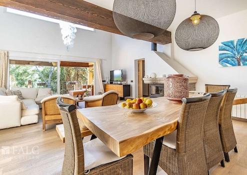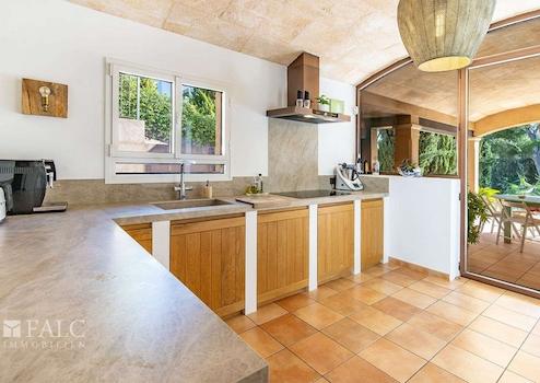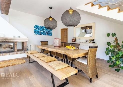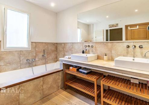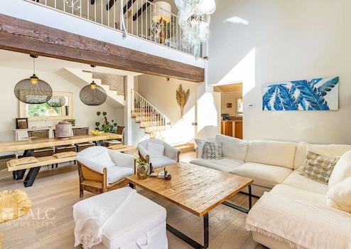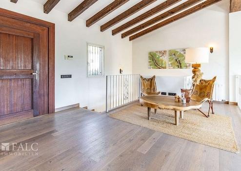 Die attraktive Immobilie mit einer Grundstücksfläche von ca. 1.060 m2 besticht mit einer hochwertigen Ausstattung und einer grosszügigen Raumaufteilung. Auf einer bebauten Fläche von ca. 375 m2 verteilen sich die Räumlichkeiten auf 2 Etagen. Das Erdgeschoss empfängt mit einer offenen Galerie und hat durch die hohen Decken einen luftigen Charakter. Vom grossen Wohn-/Essbereich mit Kamin hat man Zugang zur überdachten Terrasse und zum sonnigen Aussenbereich mit privatem Pool. Angrenzend an den Wohnbereich befindet sich die halboffene und moderne Küche mit separatem Hauswirtschaftsraum, die kürzlich erst erneuert wurde und mit einer hochwertigen Ausstattung punktet. Des Weiteren befinden sich im Erdgeschoss 2 Schlafzimmer und ein Badezimmer. Über eine Treppe gelangt man in das Obergeschoss, wo sich die grosse Master Suite mit privatem Badezimmer, mit einer Dampfsauna und einem Ankleidebereich befindet.