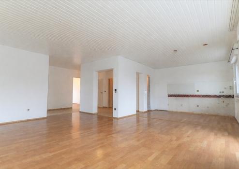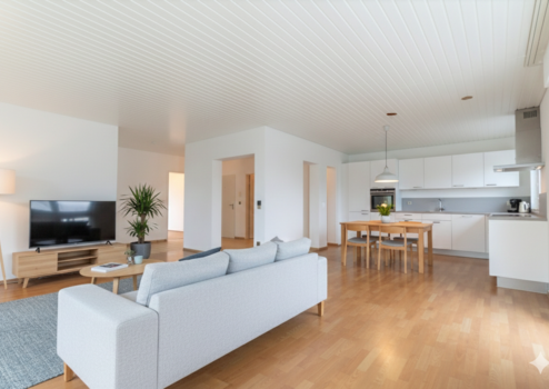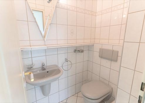 Zur linken Seite befindet sich das hell geflieste Gäste-WC. Gleich im Anschluss erreichen Sie die Küche, die durch eine Abstellkammer zusätzlichen Stauraum bietet. Von hier aus haben Sie direkten Zugang zum offenen Wohn-/ und Essbereich, der durch seine großzügige Raumgestaltung ein angenehmes Wohngefühl schafft.