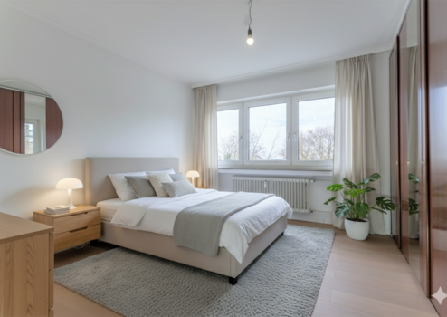 Rechts vom Tageslichtbad erwartet Sie das Hauptschlafzimmer, das genügend Platz für ein Doppelbett sowie einen geräumigen Kleiderschrank bietet. Direkt daneben liegt ein weiteres Zimmer, das sich flexibel als