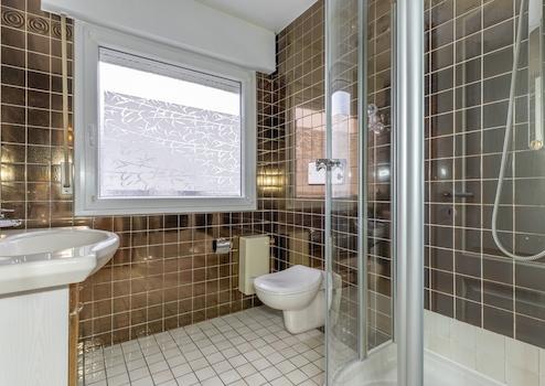 Zurück in der Diele, gegenüber dem Wohnungseingang, befindet sich das Tageslichtbad mit Dusche.