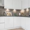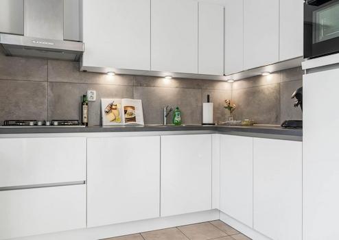 Die moderne Küche, mit L-förmigen Möbeln und einer großen Arbeitsplatte, ist mit allen Geräten ausgestattet, darunter ein 4 flammiger Gasherd, Dunstabzugshaube, Backofen, Geschirrspüler, Kühlgefrierschrank und Mikrowelle.