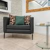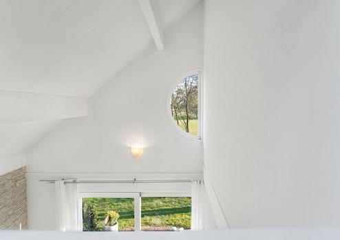 Vom Wohnzimmer aus führt eine offene Treppe in den ersten Stock.