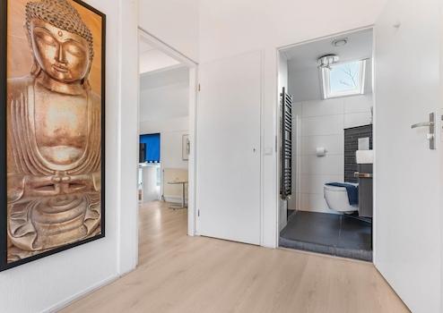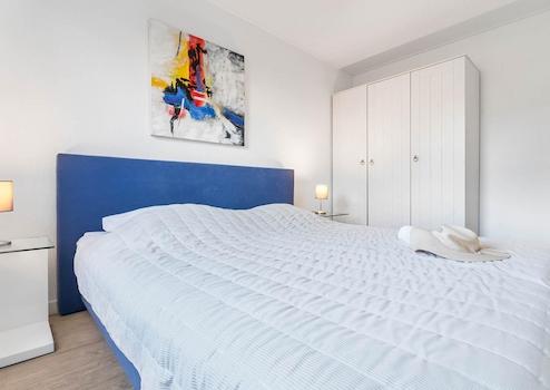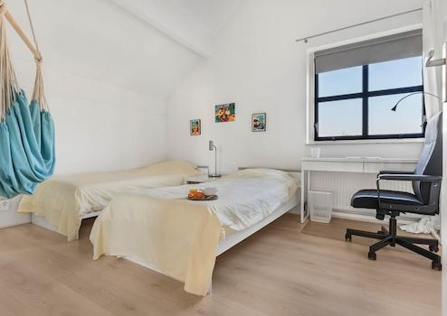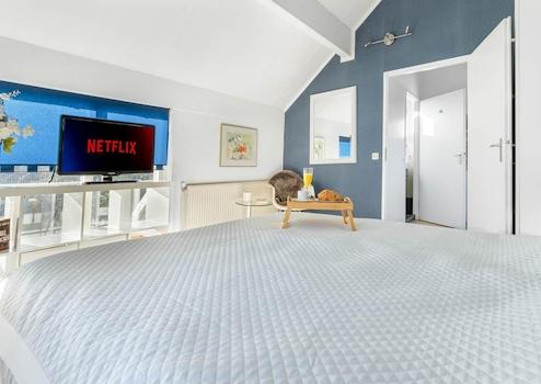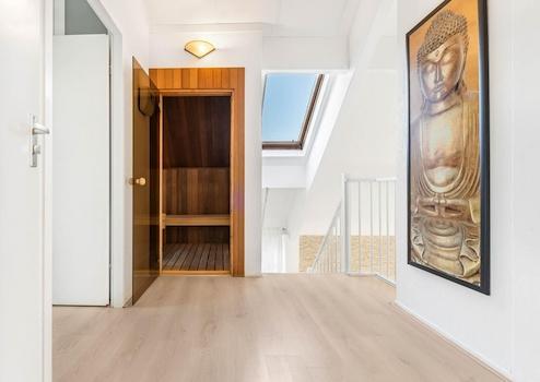 Erster Stock: Die obere Etage bietet einen Treppenabsatz mit offenem Giebel und zwei große Schlafzimmer. Das Hauptschlafzimmer hat TV und eine sehr schöne Verglasung mit Gartenblick. In dem zweiten Schlafzimmer befinden sich 2 Einzelbetten und ein Arbeitsplatz. Darüber hinaus finden Sie eine große Sauna mit Liegebereich und Dachfenster mit Dünenblick. Außerdem ein zweites Badezimmer mit ebenerdiger Dusche und Waschbecken, mit Fenster. Die Zentralheizung (Gas) und die mechanische Abluftanlage sorgen für ein optimales Raumklima.