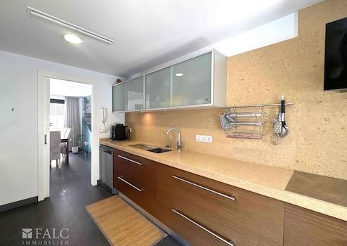 Die voll ausgestattete Küche ist harmonisch in das Wohnkonzept integriert und verfügt ebenfalls über einen direkten Zugang zur Terrasse – ideal für das Leben im mediterranen Freien.