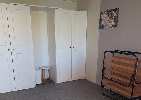 Geräumiges Schlafzimmer mit viel Platz für ein Doppelbett und Kleiderschränke. Eine Airco ist ebenfalls vorhanden.