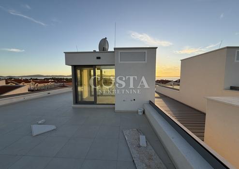 Ein geräumiges Penthouse in einem Neubau in bester Lage in Diklovac, Zadar, steht zum Verkauf. Die 82,25 m² große Wohnung befindet sich im zweiten Obergeschoss eines kleinen Wohnhauses mit sechs Wohneinheiten und Aufzug. Sie besteht aus einem großzügigen Wohnzimmer, einer Wohnküche, drei Schlafzimmern, zwei Badezimmern, einem Flur, zwei überdachten Terrassen (10 m² und 4 m²) und einer 19 m² großen Loggia. Zur Wohnung gehören außerdem eine 75 m² große Dachterrasse und zwei Garagenstellplätze. Die Gesamtfläche der Wohnung inklusive Nebengebäude beträgt 136,53 m².