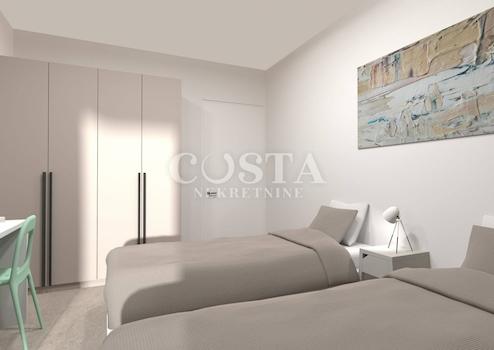 In Povljana auf der Insel Pag steht eine 2-Zimmer-Wohnung in einem Neubau zum Verkauf. Die 57,69 m² große Wohnung befindet sich im zweiten Obergeschoss eines kleinen Wohnhauses mit sechs Wohneinheiten. Sie besteht aus einem Wohnzimmer, einer Wohnküche, zwei Schlafzimmern, einem Badezimmer, einem Gäste-WC, einem Flur und einer überdachten Terrasse von 18,74 m². Zur Wohnung gehört außerdem ein privater Stellplatz im Innenhof. Die Gesamtnutzfläche der Wohnung inklusive Nebenräume beträgt 90,18 m² (KV 69,81 m²).