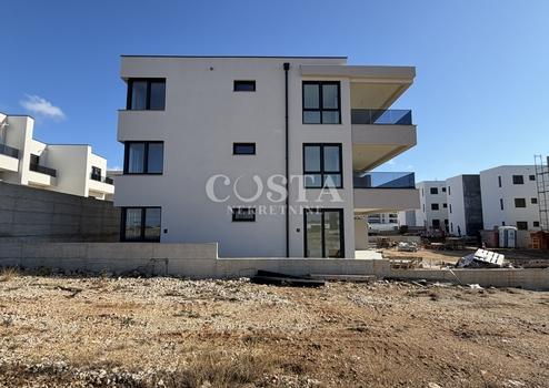 In Povljana auf der Insel Pag steht eine 2-Zimmer-Gartenwohnung in einem Neubau zum Verkauf. Die 57,87 m² große Wohnung befindet sich im Erdgeschoss eines kleinen Wohnhauses mit sechs Wohneinheiten. Sie besteht aus einem Wohnzimmer, einer Wohnküche, zwei Schlafzimmern, einem Badezimmer, einem Gäste-WC, einem Flur und einer überdachten Terrasse von zusätzlich 22 m². Zur Wohnung gehören außerdem ein 70 m² großer Garten und ein privater Stellplatz im Innenhof. Die Gesamtnutzfläche der Wohnung inklusive Nebengebäude beträgt 163,7 m² (KV 78,86 m²).