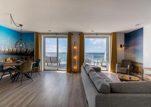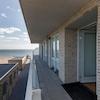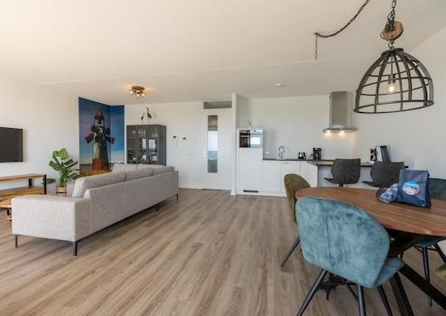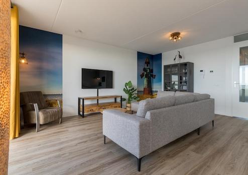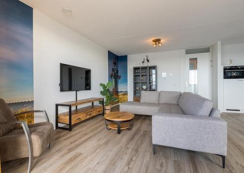 Das sonnige Wohnzimmer des Apartments De Zeester bietet ein unvergleichliches Erlebnis von Licht, Raum und Aussicht. Mit zwei Flügeltüren, die auf den großen Balkon führen, werden Innen- und Außenbereich zu einer Einheit, während man einen Panoramablick über die Oosterschelde genießen kann.