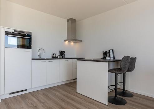 Ein verspieltes Detail ist die gemütliche kleine Bar mit Hockern, perfekt für ein gemütliches Frühstück, eine Tasse Kaffee mit Aussicht oder ein angenehmes Gespräch beim Kochen. Dank der offenen Verbindung zum Wohnzimmer bleiben Sie immer in Kontakt mit Ihrer Gesellschaft, während Sie die schöne Aussicht auf die Oosterscheldemündung genießen.