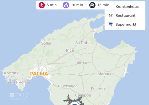 Für kleine Besorgungen und den täglichen Bedarf bietet sich der Ortskern von Campos an, der in wenigen Minuten mit dem Auto erreichbar ist. Dort finden Sie Supermärkte, Bäckereien, Banken und weitere Dienstleistungen. Auch Apotheken und ärztliche Anlaufstellen sind typischerweise im Umfeld des Ortszentrums gebündelt.