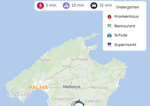 Die nächste Bushaltestelle liegt in der Nähe und sorgt für eine gute Anbindung innerhalb des Ortes und in die Umgebung. Mit dem Auto ist die Ma 19 als wichtigste Verbindung Richtung Palma schnell erreichbar. Der Flughafen Palma de Mallorca liegt je nach Verkehr etwa eine gute halbe Stunde entfernt, was die Lage auch für regelmäßige An und Abreisen attraktiv macht.
