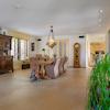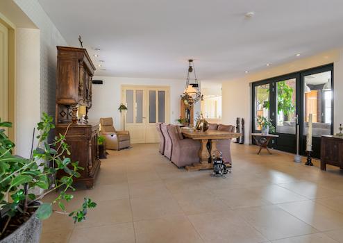 Diese luxuriös ausgeführte Immobilie ist U-förmig gebaut und verfügt über einen stimmungsvollen Innenhof. Auf der linken Seite befindet sich der Wohnbereich. Beim Betreten der großzügigen Diele fallen sofort der schöne Fliesenboden, die Treppe ins Obergeschoss sowie das stilvolle Gäste-WC mit Waschbecken auf. Von der Diele gelangen Sie in das große Wohnzimmer, das durch glatt verputzte Wände, Einbauspots und Terrassentüren zum Innenhof gekennzeichnet ist.
