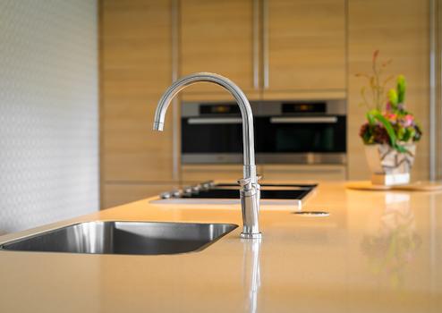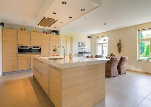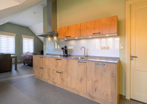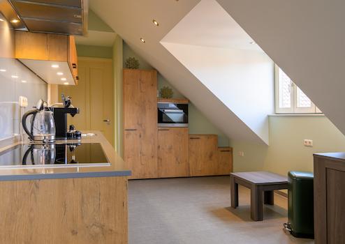 Dank der offenen Verbindung zwischen Küche, Ess- und Wohnbereich ist genügend Platz vorhanden. Die moderne halboffene Küche ist in einer praktischen Wandaufstellung installiert und durch eine Kochinsel ergänzt, wodurch reichlich Arbeits- und Stauraum vorhanden ist. Zusätzlich ist die Küche mit allen gewünschten Einbaugeräten ausgestattet: Induktionskochfeld, Spülbecken, Geschirrspüler, Dampfgarer, Kombi-Mikrowelle und Kühlschrank. Viel Tageslicht und ein schöner Blick in den Garten runden das Bild ab.