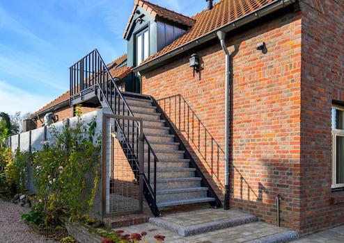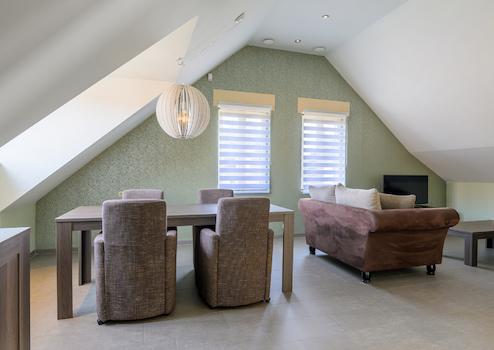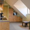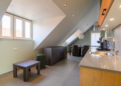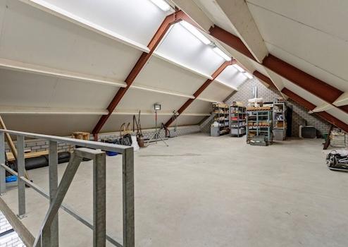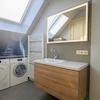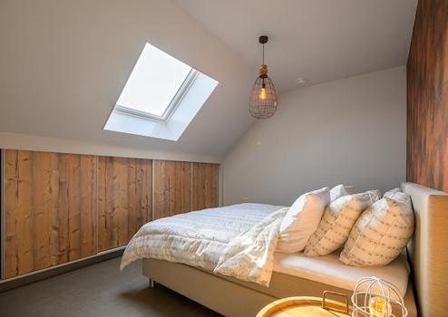 Der erste Bereich verfügt über einen großzügigen Flur, einen Technikraum, ein sehr geräumiges Schlafzimmer und einen Dachboden. Im anderen Bereich befindet sich ein Appartement. Über die Außentreppe gelangt man in eine Diele mit WC. Von dort erreicht man das große Wohn-/Esszimmer mit Küche. Das Badezimmer verfügt über Waschbecken, begehbare Dusche und Anschlüsse für Waschmaschine und Trockner. Das Schlafzimmer ist mit einem praktischen Schiebetüren-Schrank ausgestattet. Auch diese Etage verfügt über Fußbodenheizung und profitiert dank Dachfenstern von viel Tageslicht.