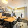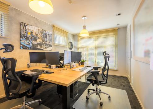 Der Bürotrakt befindet sich auf der anderen Seite des Hauses und ist über das Wohnzimmer oder über einen eigenen Eingang erreichbar. Von der Diele aus gelangt man zum WC sowie drei Büroräumen mit Stauraum, einer kleinen Küchenzeile und einem Abstellraum.