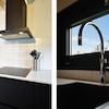 Die Küche ist elegant gestaltet mit dunklen Fronten und einer großzügigen Arbeitsfläche. Die Anordnung ist praktisch, mit Kochfeld und Dunstabzugshaube sowie einem Spülbereich am Fenster. Wie wäre es mit einem Quoocker? Wunderbar praktisch.