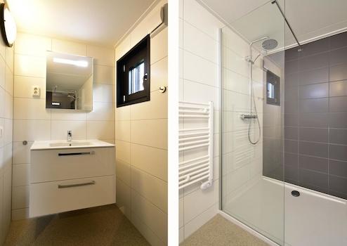 Badezimmer 1 ist das eigene Badezimmer von Schlafzimmer 1. Es ist modern gefliest und mit einem Waschbecken, einem Spiegel und einer Dusche mit Glaswand ausgestattet.