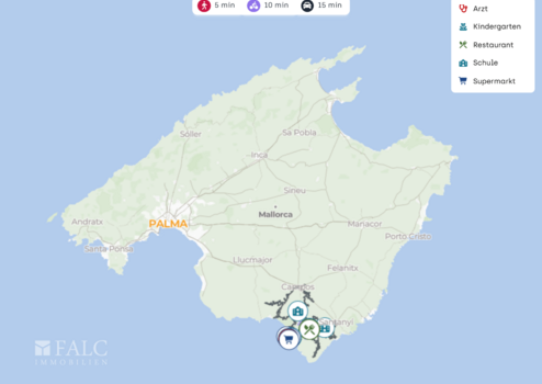 Die nächste Bushaltestelle liegt fußläufig, sodass Sie auch ohne Auto flexibel bleiben. Für längere Strecken ist die Anbindung an die überregionalen Straßen Richtung Palma und Inselosten gut nutzbar. Der Flughafen Palma de Mallorca ist mit dem Auto in etwa einer Stunde erreichbar. Ein Bahnanschluss befindet sich nicht direkt im Ort, die nächsten größeren Bahnhöfe liegen in den umliegenden Städten und sind mit dem Auto oder Bus erreichbar.
