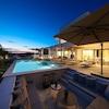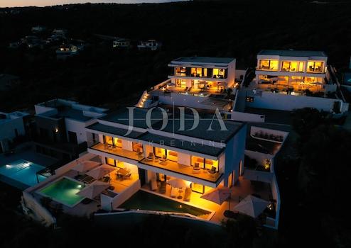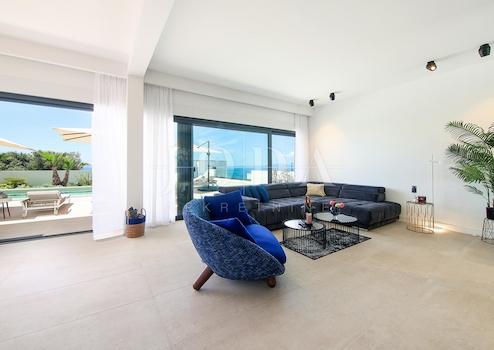 Die Villa erstreckt sich über ein Erdgeschoss und ein Obergeschoss und verfügt über fünf modern eingerichtete Schlafzimmer, jeweils mit eigenem Bad, einen großzügigen Wohnbereich mit moderner Küche und Essbereich sowie ein geräumiges Wohnzimmer mit großen Glasfronten. Neben dem modernen Interieur besticht das Haus durch einen gepflegten Garten mit beheiztem Infinity-Pool, Sonnenterrasse, Lounge-Bereich und Grillplatz.