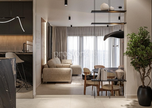 Der Zugang zur Wohnung erfolgt über einen imposanten, verglasten Eingangsbereich mit großzügigem Vorraum und vorgesehener Nische für eine Garderobe. Der Wohn- und Essbereich ist nahezu vollständig verglast und bietet einen Blick auf den grünen Gürtel, wodurch ein starkes Gefühl von Offenheit und Ruhe entsteht. Die Küche ist durch eine sanfte Niveauverschiebung dezent abgetrennt und verfügt über viel Tageslicht.