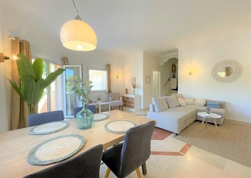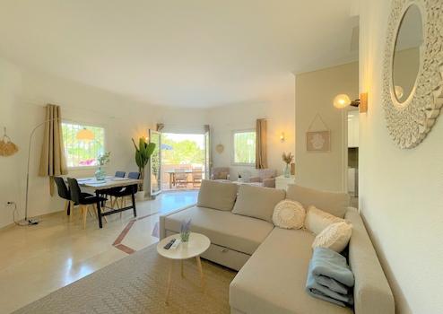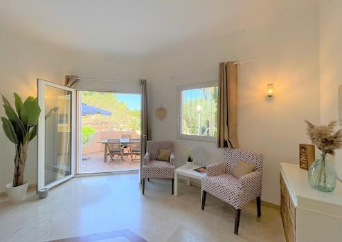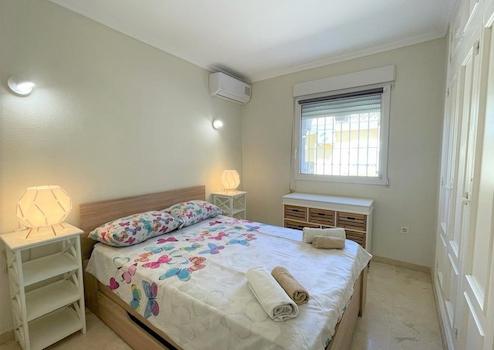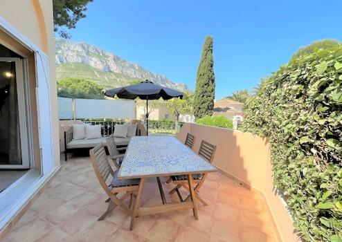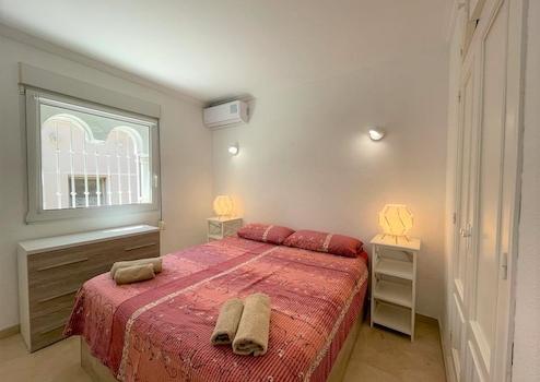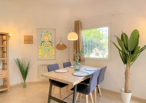 Diese moderne Villa liegt in einer schönen Gemeinschaftsanlage in Denia, ca. 2 km vom Meer und vom Stadtzentrum entfernt. Hier können Sie den perfekten Familienurlaub geniessen mit entspanntem Bergblick. Das Objekt wurde 2019 umfassend renoviert und ist durch 5 Stufen auf zwei Etagen aufgeteilt. In der unteren Hauptetage befindet sich ein helles und freundliches Wohnzimmer mit einer (Schlaf-)Couch sowie einem Essbereich und direktem Zugang zur schönen und großzügigen Außenterrasse. Diese Terrasse eignet sich perfekt um ein Frühstück im Freien zu genießen oder einen Grillabend zu planen, da Sie auch über einen elektrischer Tischgrill verfügen. Auf der gleichen Hauptetage befindet sich eine moderne, eingebaute und voll ausgestattete Küche mit Kühlschrank inkl. integriertem Gefrierfach, Induktionsfeld, Backofen, Geschirrspüler, Toaster, Kaffeemaschine und vieles mehr. Zur oberen Etage gelangen Sie durch 5 kleine Stufen und dort befinden sich die 2 Doppelschlafzimmer, eins davon mit Badezimmer en Suite. Das zweite Duschbad befindet sich separat auf der gleichen Etage. Beide Schlafzimmer als auch das Wohnzimmer verfügen über Klimaanlagen warm/kalt. Hat auch einen Schreibtisch und Monitor, somit ideal zur Nutzung als Home-Office-Platz im Wohnzimmer. Laptop anschließen und los geht´s. WIFI ist im ganzen Haus vorhanden. Um das Angebot zu toppen, verfügen Sie über einen wunderschönen Gemeinschaftspool mit gepflegten Rasenflächen und schönem Palmenbestand. Auch ein Parkplatz mit Carport steht Ihnen für Ihren PKW zur Verfügung, direkt neben der Haustüre der Villa.