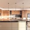 Die maßgefertigte Designer-Küche aus edlem Naturstein-Quarzit Amarula verbindet ästhetische Klarheit mit modernster Technik. Hochwertige Miele®-Einbaugeräte, darunter ein Induktionskochfeld mit integriertem Dunstabzug, Dampfgarer, Backofen, Mikrowelle, Einbau-Kaffeemaschine sowie Smart-Kühl- und Gefrierkombination, Smart-Geschirrspüler und ein doppelter Weinkühlschrank, lassen keine Wünsche offen. Ergänzt wird die Ausstattung durch einen Quooker®-Wasserhahn, ein Osmose-Filtersystem, eine Wasserenthärtungsanlage sowie indirekt beleuchtete Glaselemente. Grifflose Schranksysteme mit Soft-Close-Mechanik betonen die elegante, puristische Linienführung.