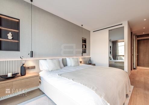 Beide Schlafzimmer sind mit edlem Echtholzparkett ausgestattet und verfügen über maßgefertigte Bettrückwände aus Stoff- und Holzlamellen. Beleuchtete Nischen, ca. sechs Meter lange Soft-Touch-Einbaukleiderschränke mit integriertem Schuhschrank sowie großzügige Abstellflächen sorgen für höchsten Komfort. Premium-Fenster von Schüco® mit Schallschutzverglasung, Sonance®-Deckenlautsprecher und Smart-TVs ergänzen die luxuriöse Ausstattung. Jedes Schlafzimmer verfügt über ein eigenes Bad en suite.