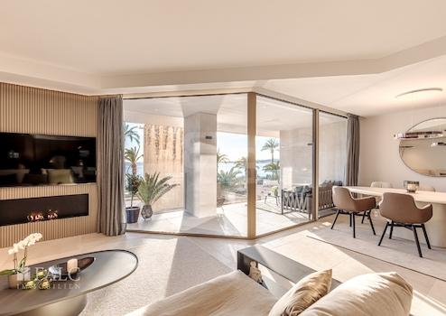 Großzügige Raumdimensionen und ein durchdachter Grundriss prägen das Apartment. Der offen gestaltete Wohn-, Ess- und Küchenbereich mit einer Fläche von knapp 90 m² bildet das Herzstück der Immobilie und eröffnet einen unverbaubaren, weiten Blick auf das Meer. Ergänzt wird dieser durch eindrucksvolle Perspektiven auf die Hafenpromenade und die Skyline von Palma. Eine rund 10 m² große Loggia erweitert den Wohnraum und schafft dank vollständig zu öffnender Glasfronten ein fließendes Indoor-Outdoor-Wohnerlebnis.