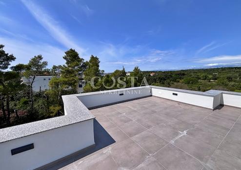 In Punta Radman in Petrčane bei Zadar steht ein geräumiges Penthouse in einem Neubau zum Verkauf. Die 109 m² große Wohnung befindet sich im zweiten Obergeschoss eines kleinen Wohnhauses. Sie besteht aus einem Wohnzimmer, einer Wohnküche, drei Schlafzimmern, zwei Badezimmern, einem Gäste-WC, einem Flur und einer Terrasse. Zur Wohnung gehört außerdem eine großzügige Dachterrasse mit freiem Meerblick sowie zwei private Parkplätze im Innenhof des Gebäudes. Die Gesamtfläche der Wohnung inklusive aller Ausstattungsgegenstände beträgt 141 m².