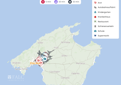 Die nächste Bushaltestelle liegt fußläufig, sodass Sie auch ohne Auto flexibel bleiben. Zudem ist eine Bahnstation in wenigen Minuten erreichbar und schafft eine komfortable Verbindung Richtung Palma und ins Inselinnere. Mit dem Auto gelangen Sie zügig zur Autobahnauffahrt, was Pendeln und Ausflüge erleichtert. Der Flughafen Palma de Mallorca ist je nach Verkehr in etwa 15 bis 25 Minuten erreichbar.